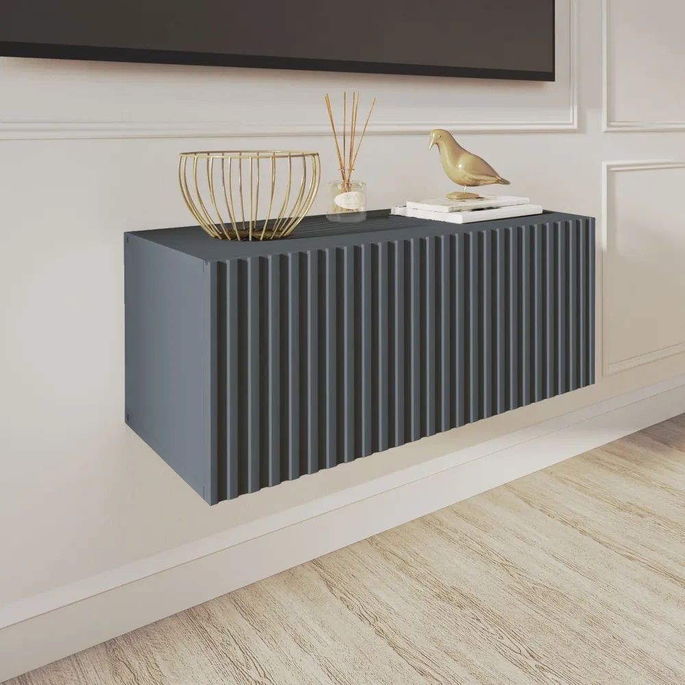 Благодаря своей компактности тумба под ТВ подвесная поможет сэкономить пространство, избежать ощущения загромождённости гостиной, спальни или детской комнаты, а рифлёный фасад будет акцентировать